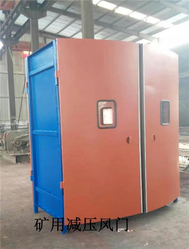 礦用減壓風門是由門扇、門框、聯結件,合頁、等組成,風門適用于井下風壓過大的場所使用,在一些高風壓的場所中風門做成圓弧樣式這樣一來風壓接觸面變小,不會造成加壓下風門變形的情況,風門四邊卯上密封膠條,在風門打開后,無論先關閉左側或右側,門扇的密封條均可將后關閉的一扇風門的中間空隙封閉,在防漏風穩風壓調節風量上也較為突出,在一些頻繁行人的場所,只要在一扇門扇上開行人小門即可解決頻繁開門風量不穩定的現象。