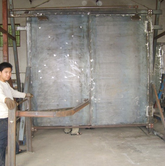 3、門框采用鋼制型材焊接而成;門扇采用鋼制型材做骨架,與鋼質板材折做而成的外圍盒體組焊而成;門扇與聯桿連接調節配重,使得風門能可靠關閉。