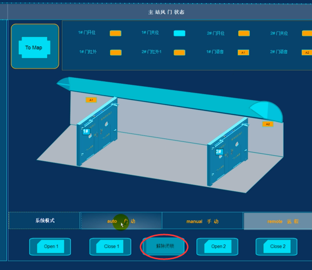 當(dāng)井下出現(xiàn)緊急情況或者做反風(fēng)試驗(yàn)時(shí),需要兩道風(fēng)門同時(shí)打開時(shí),遠(yuǎn)程模式還可以接觸兩道風(fēng)門之間的閉鎖,閉鎖接觸后,兩道風(fēng)門同時(shí)打開,方便人員與車輛撤離。