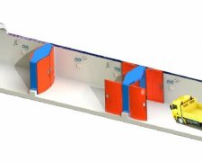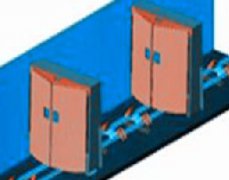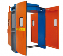 一套安全聯(lián)鎖減壓風(fēng)門(mén)有四個(gè)反風(fēng)門(mén)和四個(gè)正風(fēng)門(mén)及2組框架結(jié)構(gòu)的門(mén)框組成,頂部橫梁呈三角形結(jié)構(gòu),門(mén)扇與風(fēng)壓流向成一定的夾角,把壓在門(mén)扇上的壓力分解一部分除去,減輕開(kāi)閉門(mén)扇需要的力氣。門(mén)扇大部分要求表面為弧形增強(qiáng)抗壓性能,在門(mén)扇上有行人小門(mén)和觀察窗,單獨(dú)是行人通過(guò)時(shí)沒(méi)有必要把這么大的門(mén)扇都打開(kāi),只是從行人小門(mén)經(jīng)過(guò)即可。