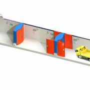 一套安全聯鎖減壓風門有四個反風門和四個正風門及2組框架結構的門框組成,頂部橫梁呈三角形結構,門扇與風壓流向成一定的夾角,把壓在門扇上的壓力分解一部分除去,減輕開閉門扇需要的力氣。門扇大部分要求表面為弧形增強抗壓性能,在門扇上有行人小門和觀察窗,單獨是行人通過時沒有必要把這么大的門扇都打開,只是從行人小門經過即可。